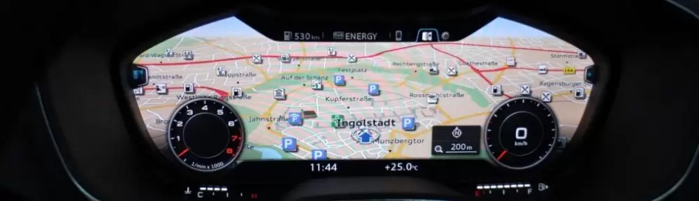 D’entrée de jeu, on remarque tout de suite que l’écran LCD de 12 pouces qui contient des informations en tout genre incluant la navigation est situé directement derrière le volant, dans le tableau de bord. Remplaçant ainsi les traditionnels compteurs à aiguilles. Un écran innovant au design épuré qui ne nécessite aucune connexion à internet peut être personnalisé selon les préférences du conducteur. L’affichage épouse la forme du volant et les compteurs sont affichés par-dessus la carte de navigation. Le résultat est clair et ultra-moderne.